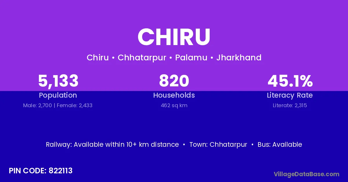 Chiru village is located in the Chhatarpur Subdivision of the Palamu district in Jharkhand .