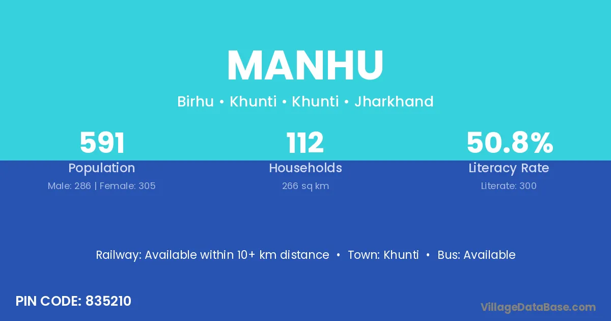 The literacy rate of Manhu village is 55.26%. Male literacy stands at 65.52% and female literacy at 43.47%.
