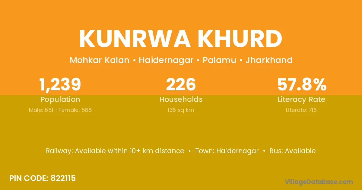 Kunrwa Khurd village has a total population of 1,239 people, of which 651 are males and 588 are females.