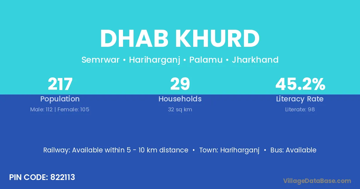 Dhab Khurd village has a total population of 217 people, of which 112 are males and 105 are females.