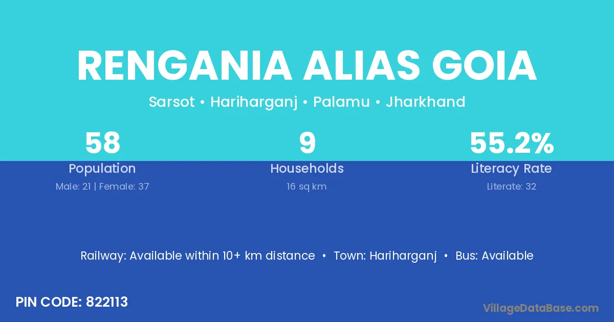Rengania Alias Goia village has a total population of 58 people, of which 21 are males and 37 are females.