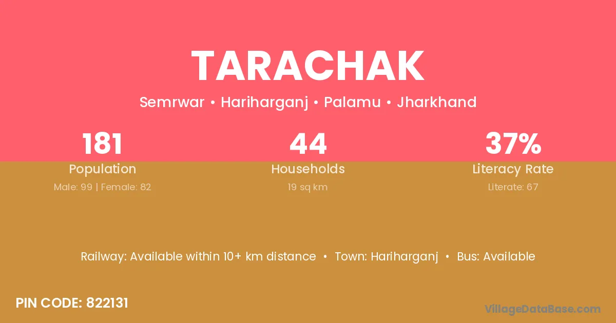 The literacy rate of Tarachak village is 37.02%. Male literacy stands at 47.47% and female literacy at 24.39%.