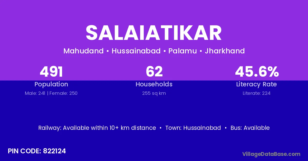 Salaiatikar village has a total population of 491 people, of which 241 are males and 250 are females.
