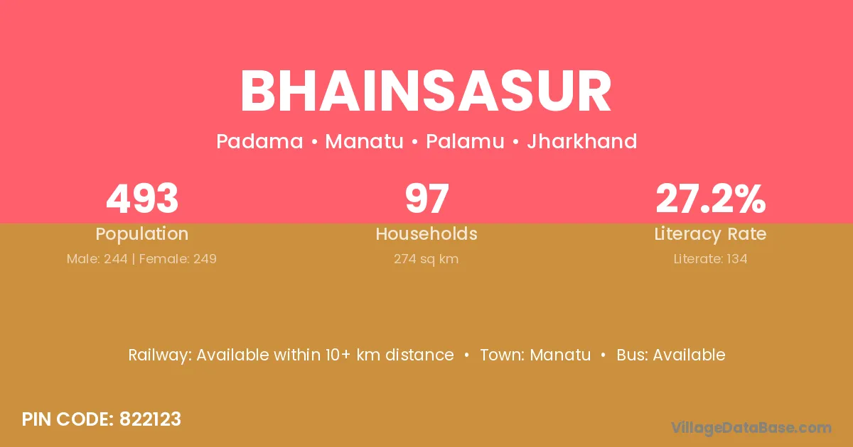 Bhainsasur village has a total population of 493 people, of which 244 are males and 249 are females.