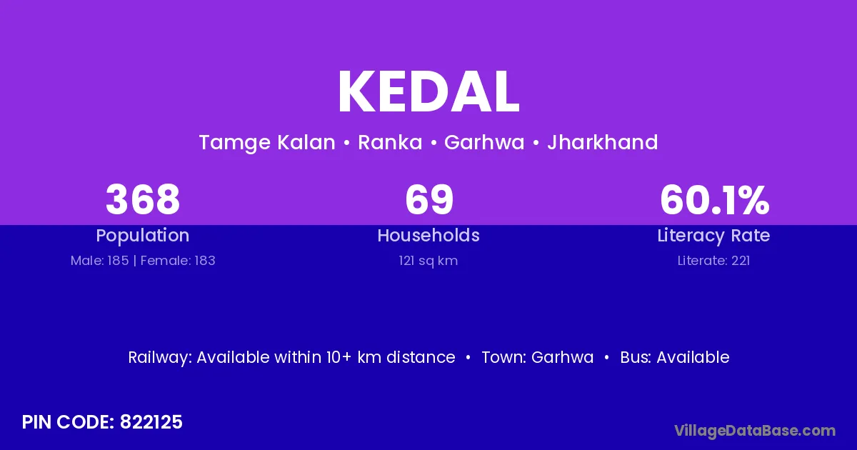 The literacy rate of Kedal village is 17.28%. Male literacy stands at 20.31% and female literacy at 13.77%.