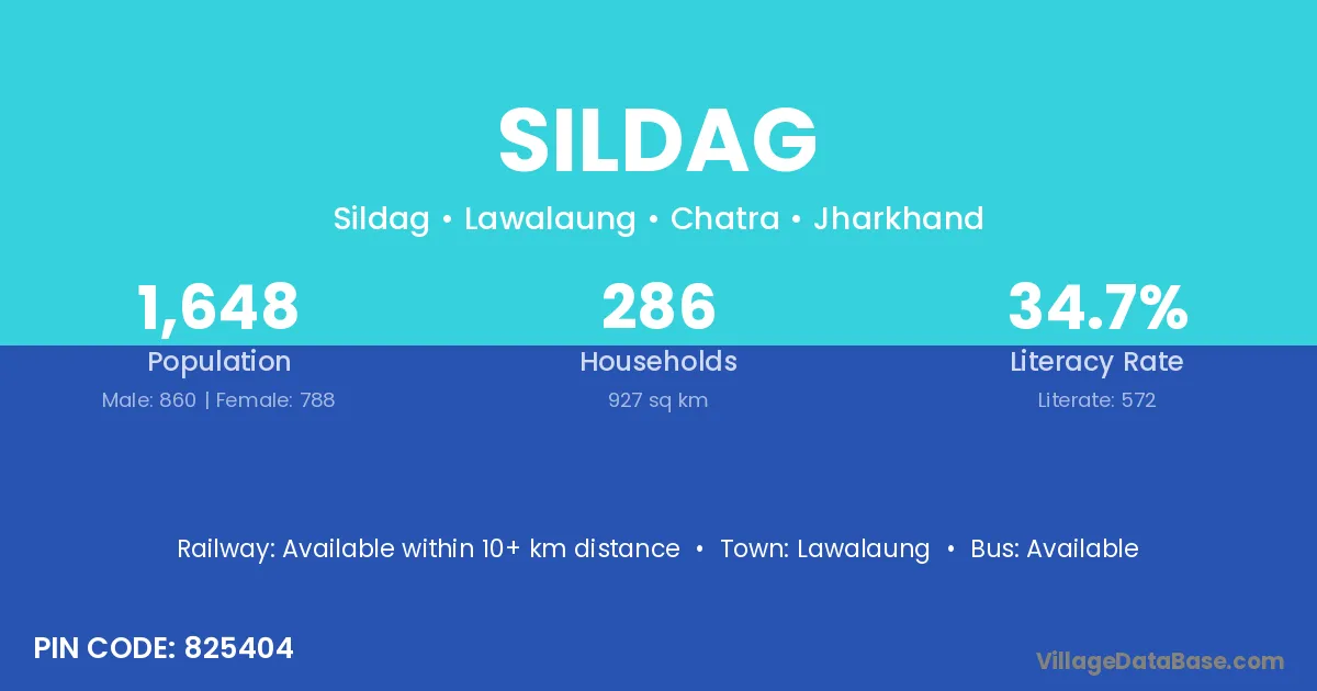 The literacy rate of Sildag village is 37.10%. Male literacy stands at 47.86% and female literacy at 25.00%.
