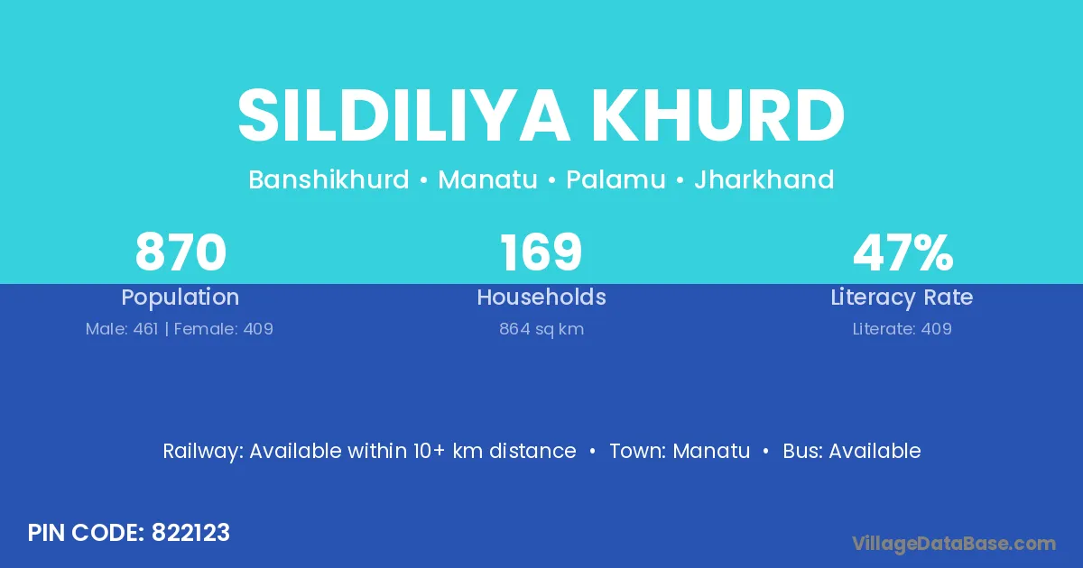 Sildiliya Khurd village has a total population of 870 people, of which 461 are males and 409 are females.