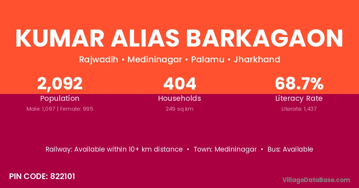 Kumar Alias Barkagaon village has a total population of 2,092 people, of which 1,097 are males and 995 are females.