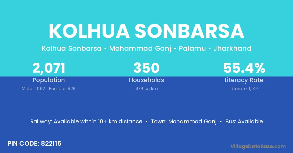 Kolhua Sonbarsa village has a total population of 2,071 people, of which 1,092 are males and 979 are females.
