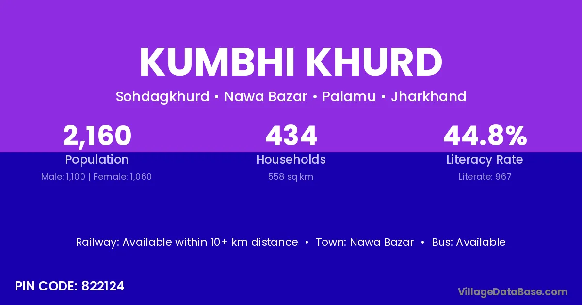 Kumbhi Khurd village has a total population of 2,160 people, of which 1,100 are males and 1,060 are females.