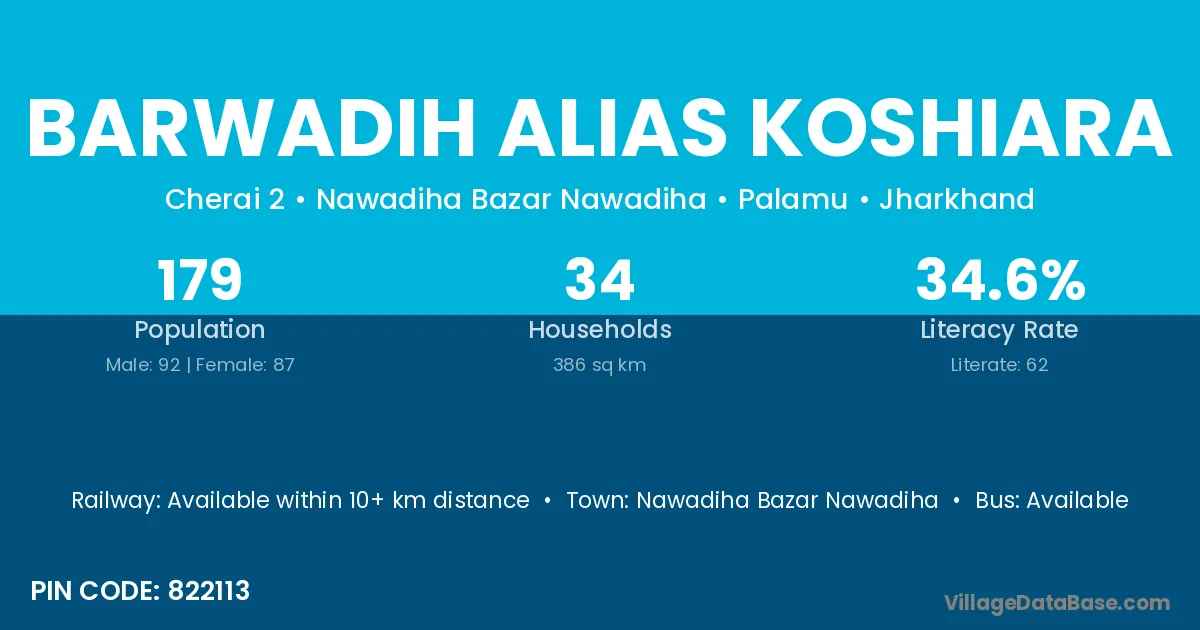 Barwadih Alias Koshiara village has a total population of 179 people, of which 92 are males and 87 are females.