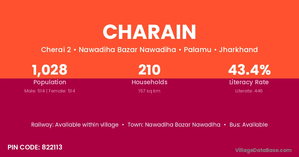 Charain village has a total population of 1,028 people, of which 514 are males and 514 are females.