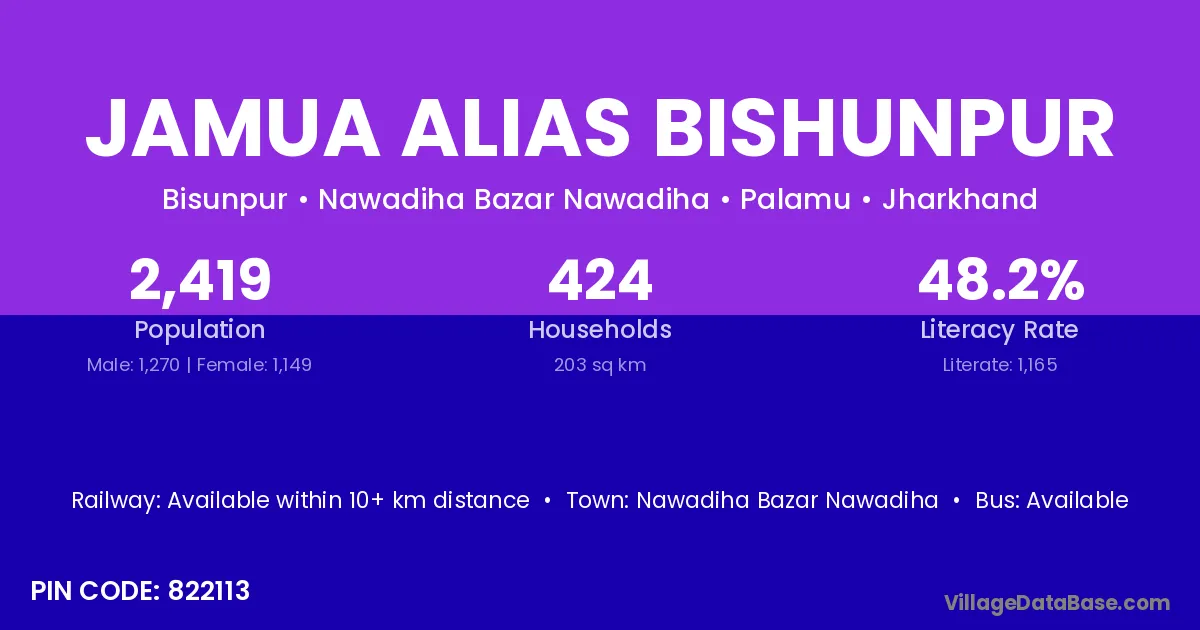 Jamua Alias Bishunpur village has a total population of 2,419 people, of which 1,270 are males and 1,149 are females.
