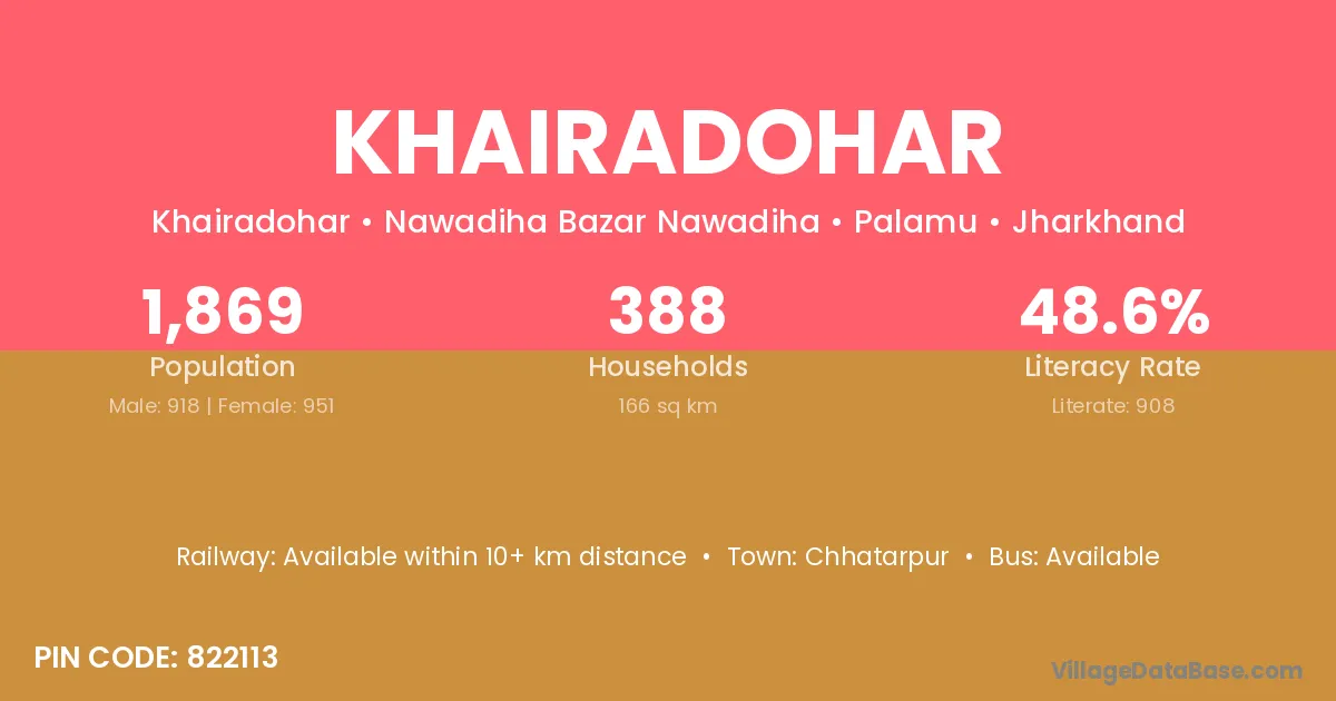Khairadohar village has a total population of 1,869 people, of which 918 are males and 951 are females.