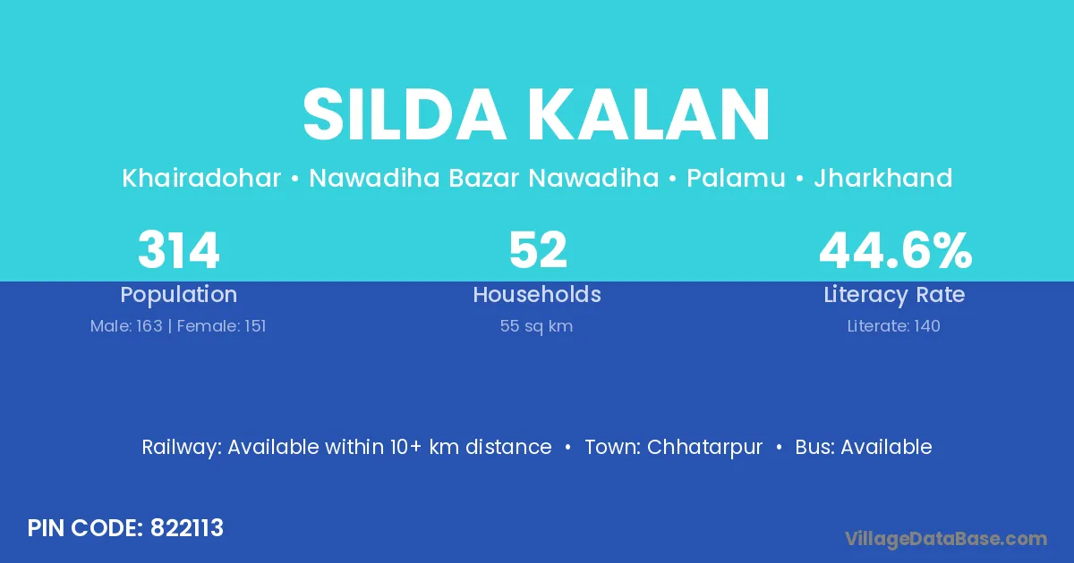 Silda Kalan village has a total population of 314 people, of which 163 are males and 151 are females.