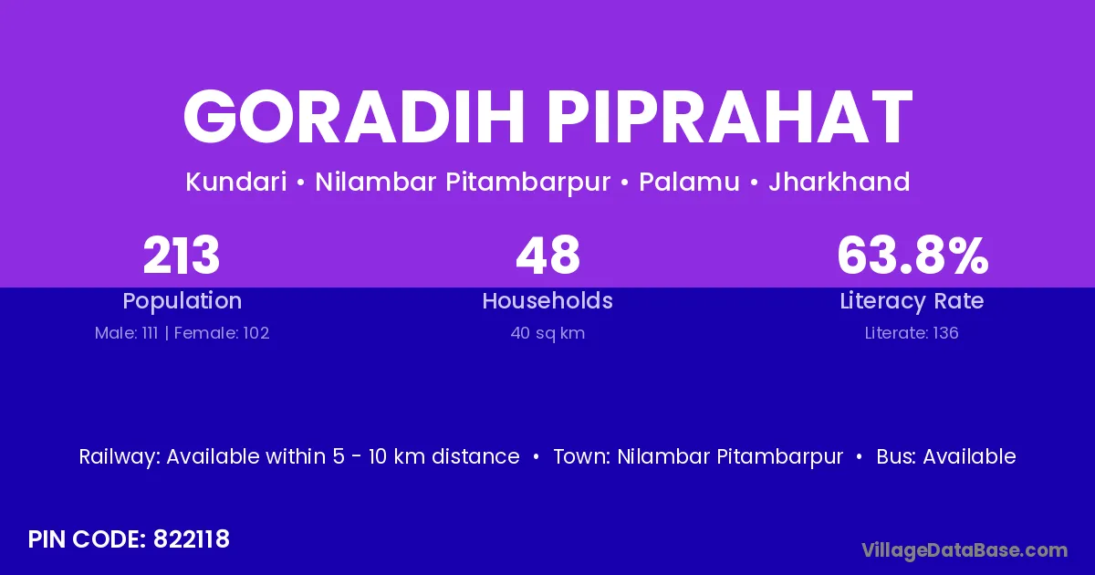 Goradih Piprahat village has a total population of 213 people, of which 111 are males and 102 are females.