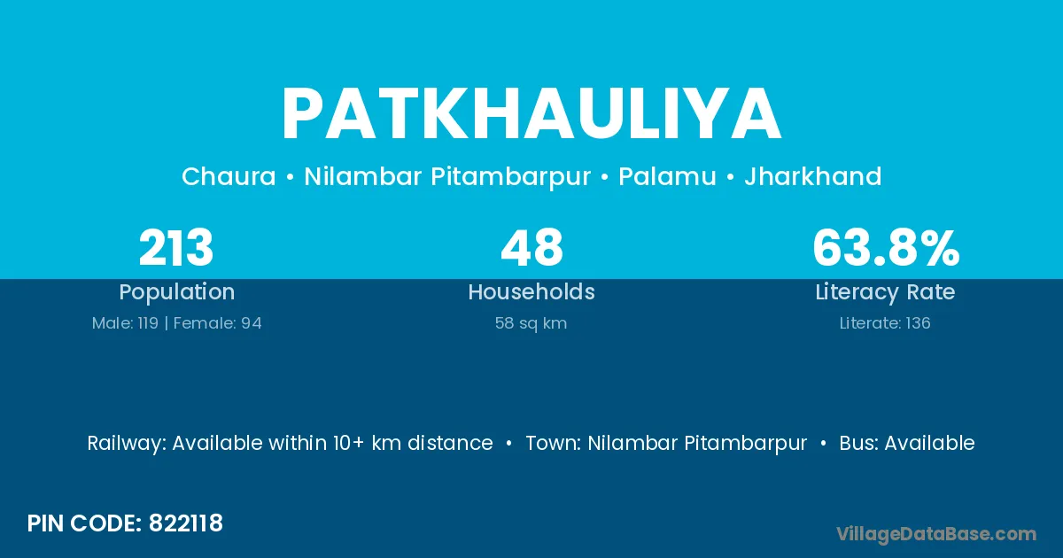 Patkhauliya village has a total population of 213 people, of which 119 are males and 94 are females.