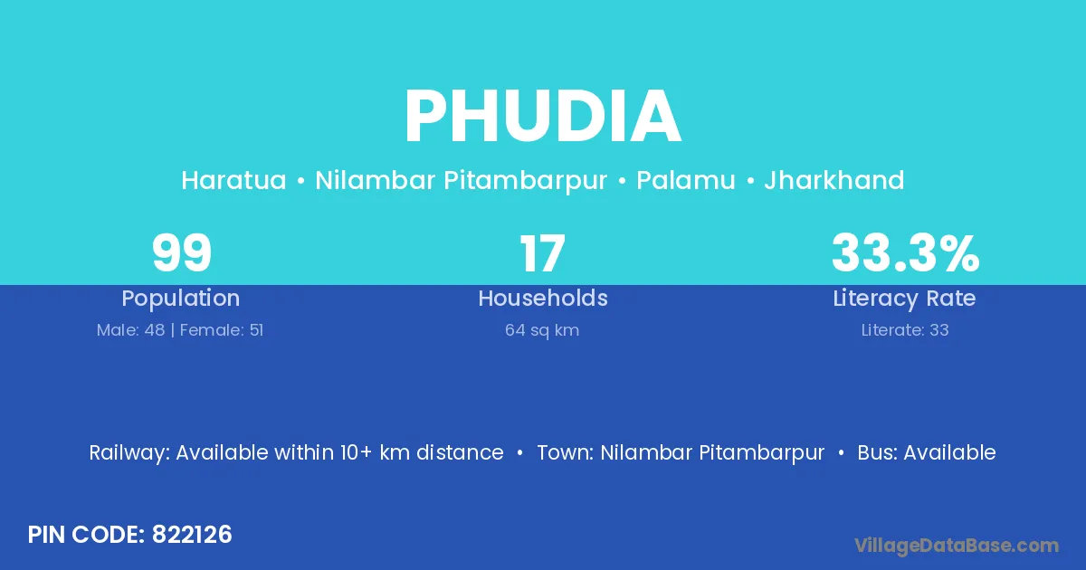 Nilambar Pitambarpur is the nearest town to Phudia village for major economic activities
