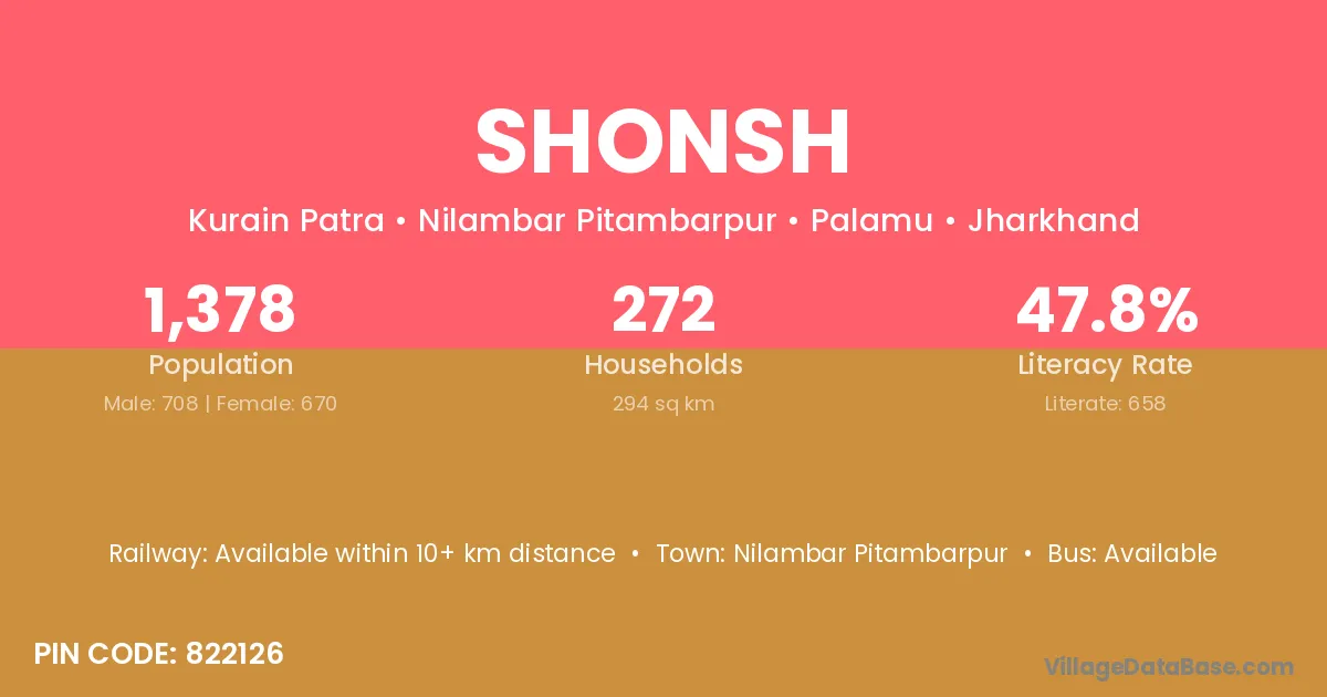 Shonsh village has a total population of 1,378 people, of which 708 are males and 670 are females.