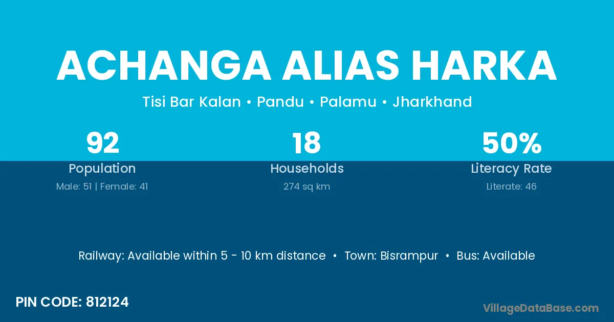 Achanga Alias Harka village has a total population of 92 people, of which 51 are males and 41 are females.