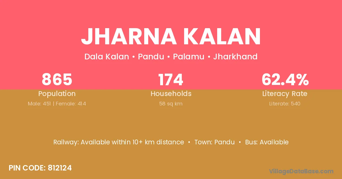 Jharna Kalan village has a total population of 865 people, of which 451 are males and 414 are females.