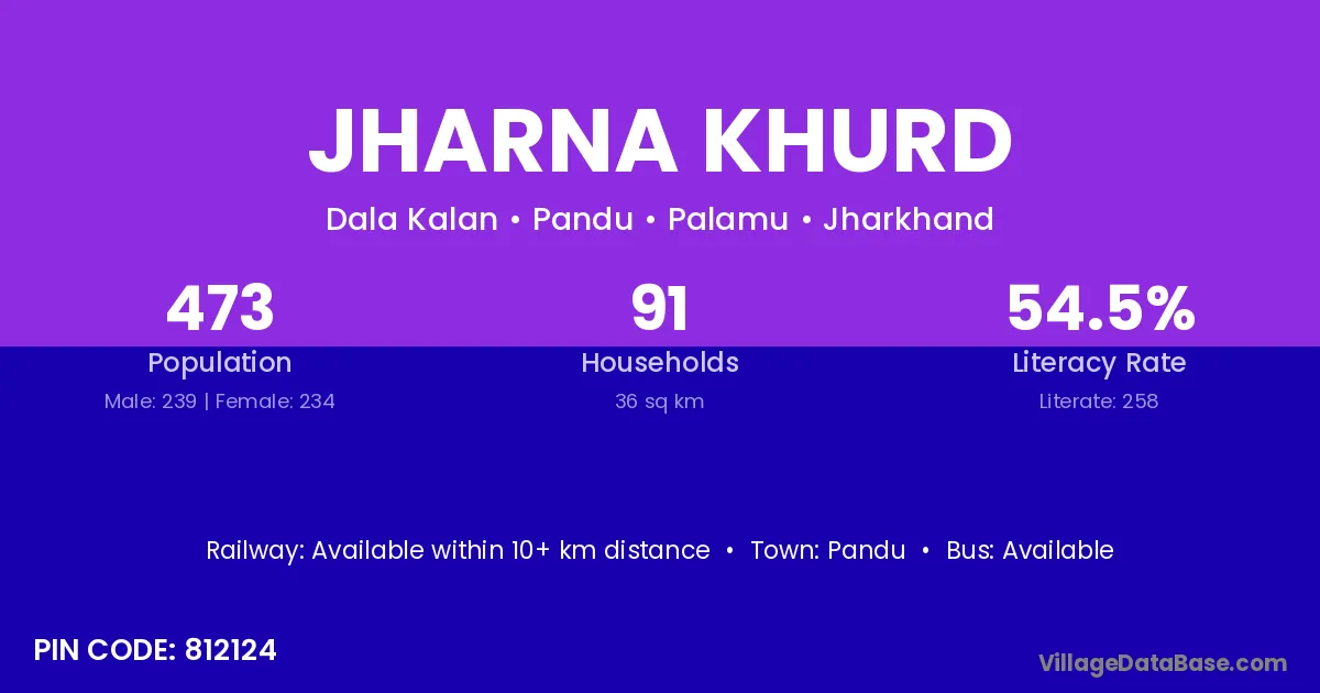 Jharna Khurd village has a total population of 473 people, of which 239 are males and 234 are females.