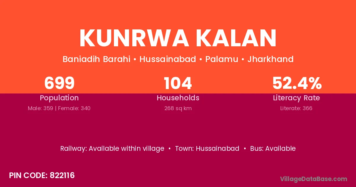 The literacy rate of Kunrwa Kalan village is 51.94%. Male literacy stands at 63.92% and female literacy at 39.00%.