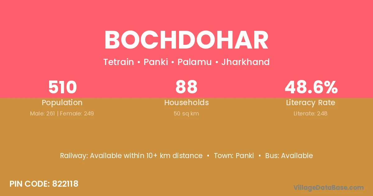 Bochdohar village has a total population of 510 people, of which 261 are males and 249 are females.