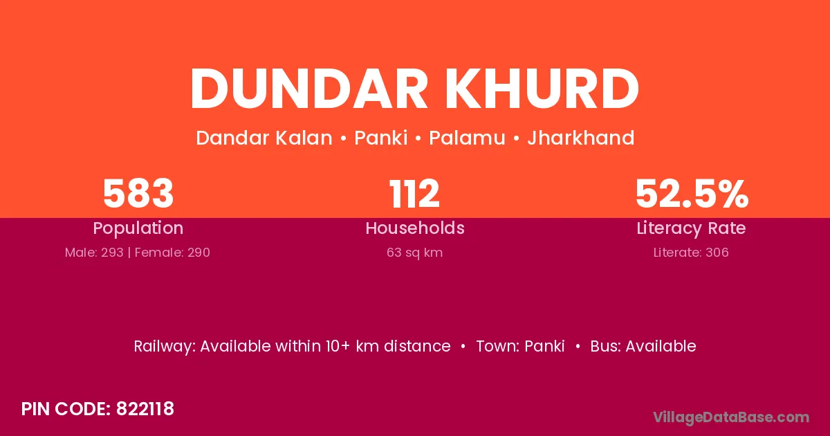 Dundar Khurd village has a total population of 583 people, of which 293 are males and 290 are females.