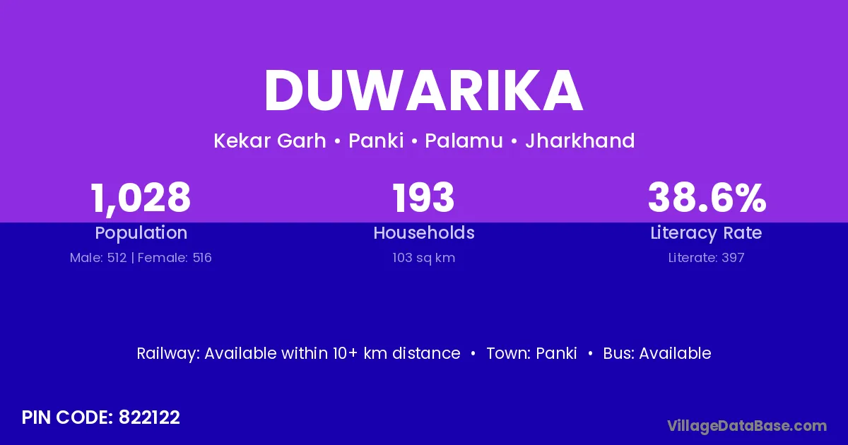 Duwarika village has a total population of 1,028 people, of which 512 are males and 516 are females.