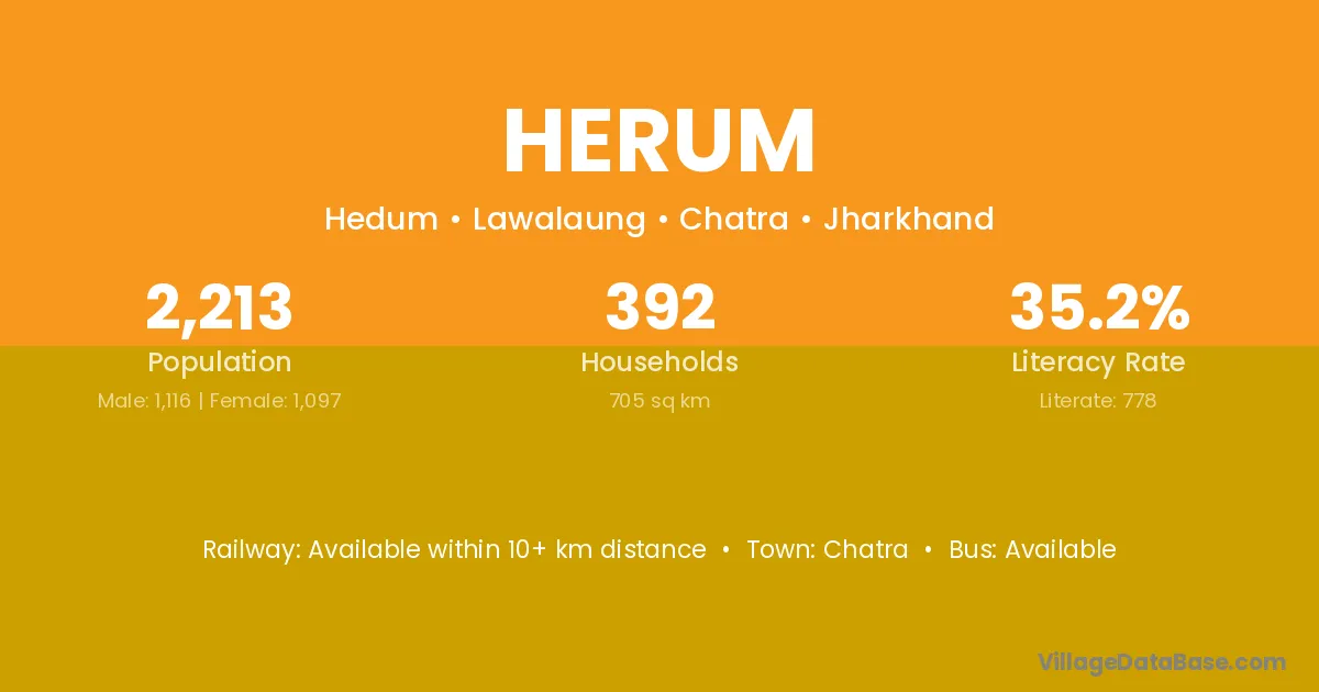 The literacy rate of Herum village is 26.77%. Male literacy stands at 36.10% and female literacy at 17.65%.
