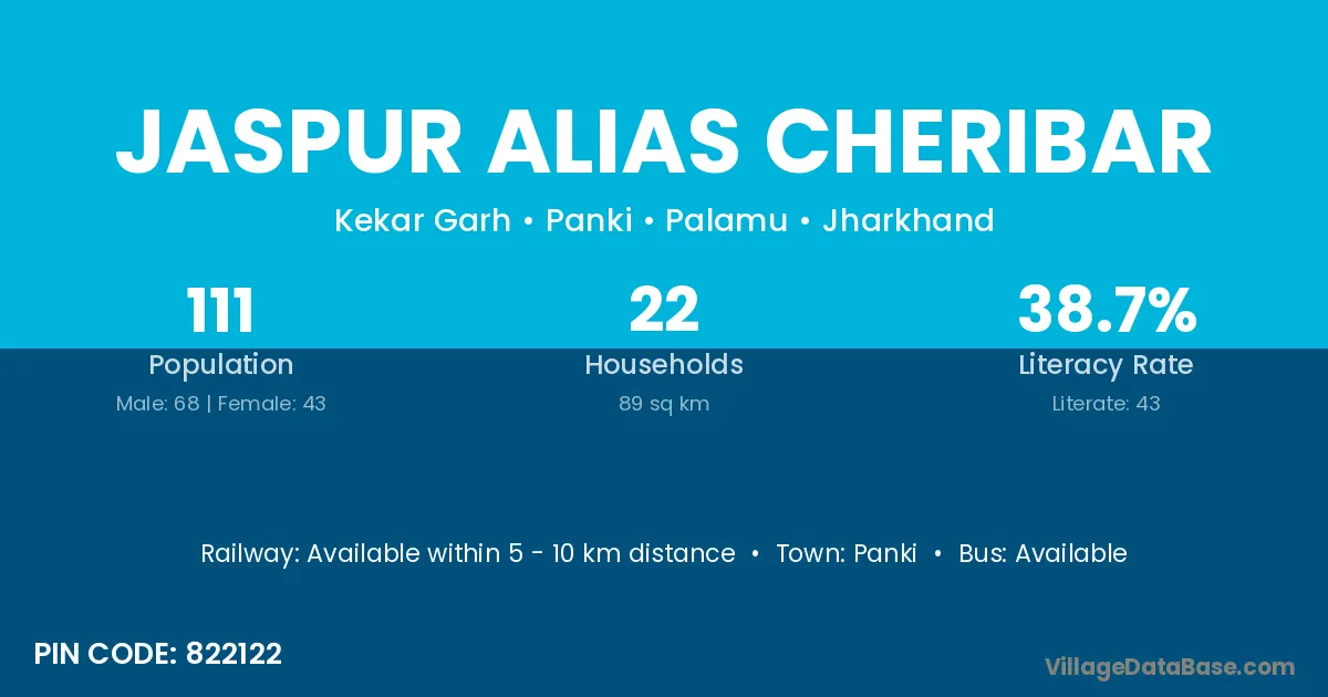 Jaspur Alias Cheribar village has a total population of 111 people, of which 68 are males and 43 are females.