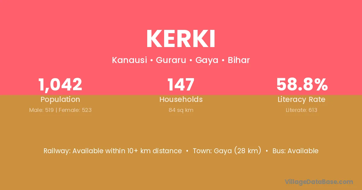Kerki village has a total population of 472 people, of which 245 are males and 227 are females.