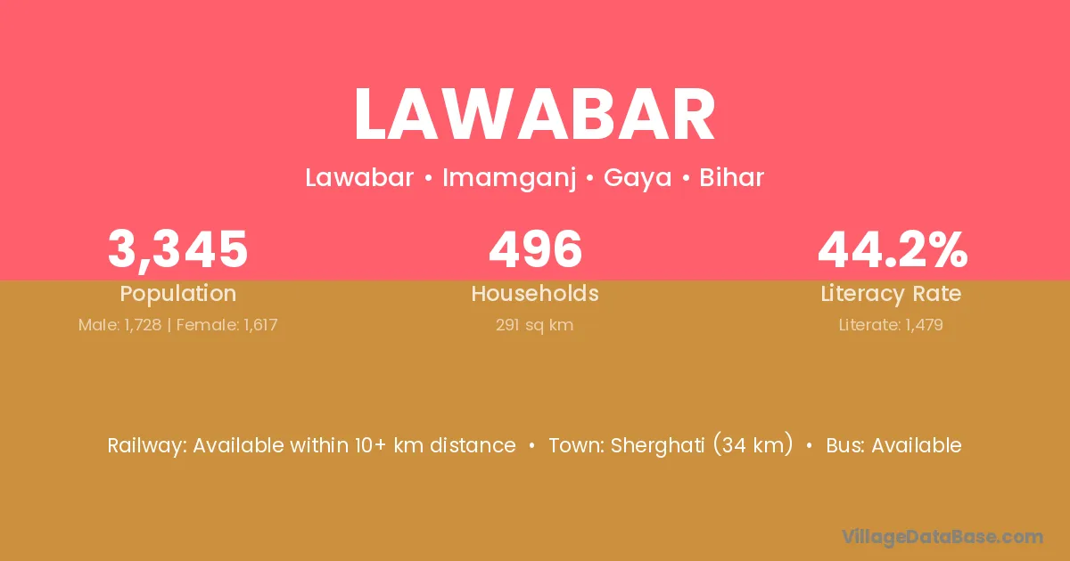 The literacy rate of Lawabar village is 23.87%. Male literacy stands at 32.23% and female literacy at 13.86%.