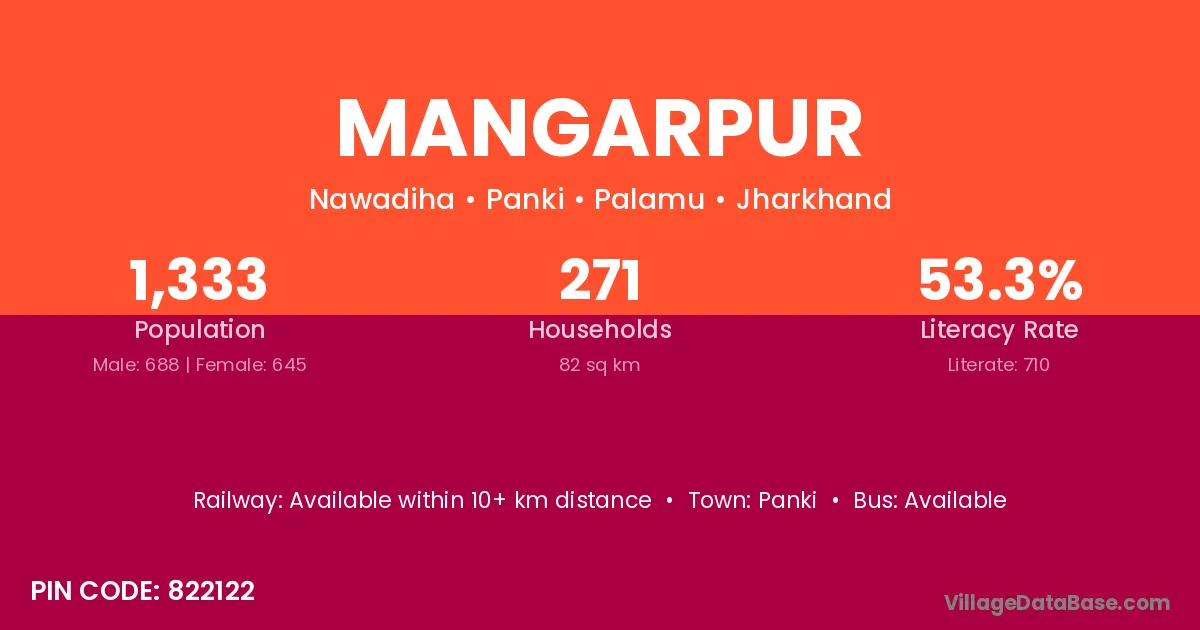Mangarpur village has a total population of 1,333 people, of which 688 are males and 645 are females.