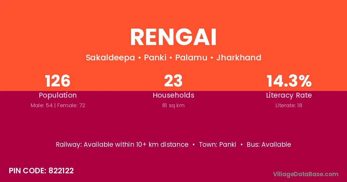 The literacy rate of Rengai village is 14.29%. Male literacy stands at 22.22% and female literacy at 8.33%.