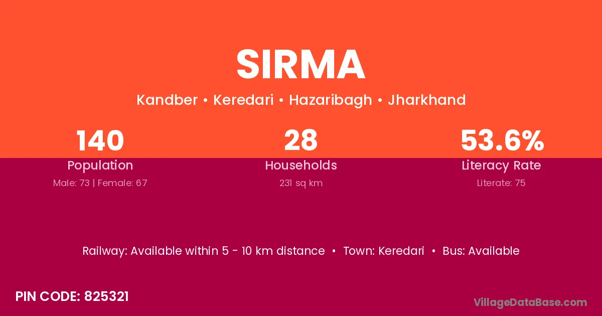 The literacy rate of Sirma village is 45.00%. Male literacy stands at 57.26% and female literacy at 32.13%.