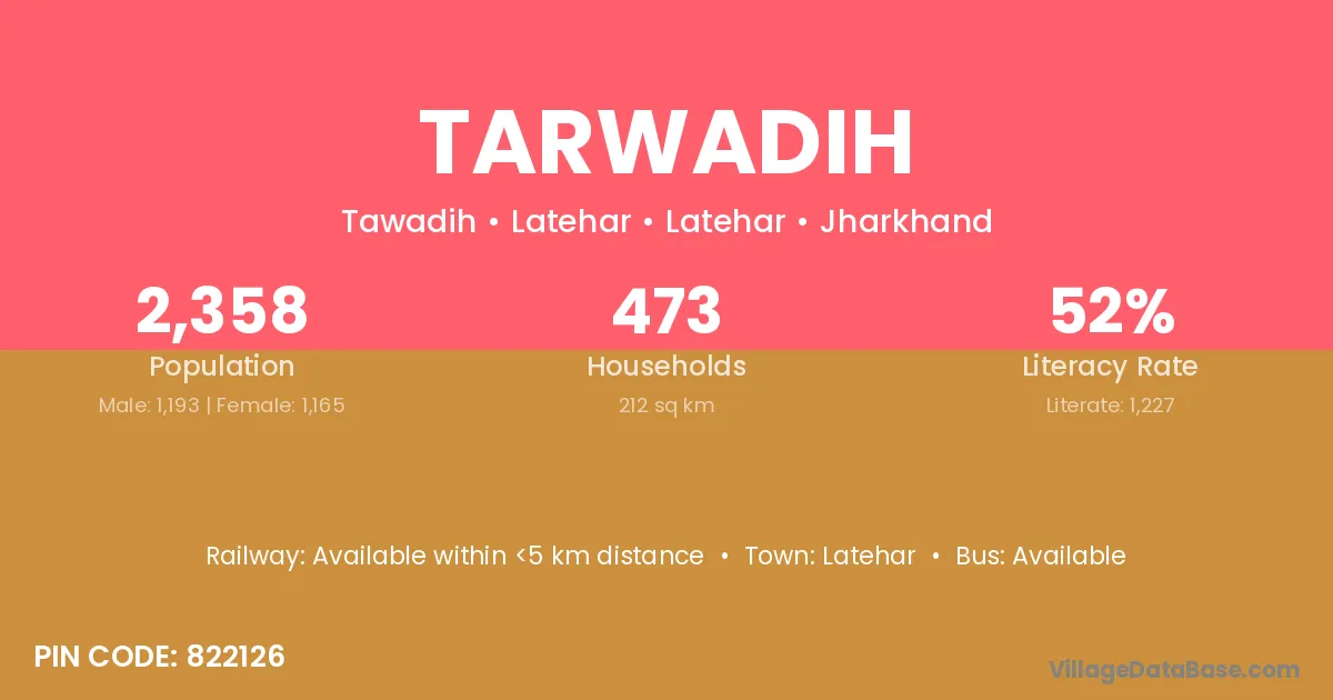 The literacy rate of Tarwadih village is 51.52%. Male literacy stands at 58.65% and female literacy at 44.27%.