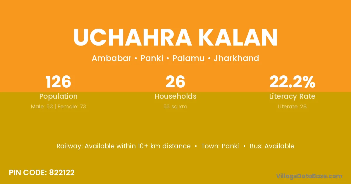 The literacy rate of Uchahra Kalan village is 22.22%. Male literacy stands at 22.64% and female literacy at 21.92%.