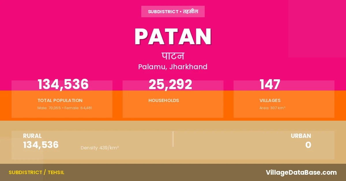 Patan is a town and Subdivision in the Palamu district of the Jharkhand. In India, a Subdivision is a subdivision of a district responsible for the administration and revenue collection of a specific area within the district. Subdivisions play a crucial role in the local governance structure, contributing significantly to the development and administration of their communities.