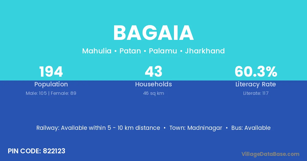 Bagaia village has a total population of 194 people, of which 105 are males and 89 are females.