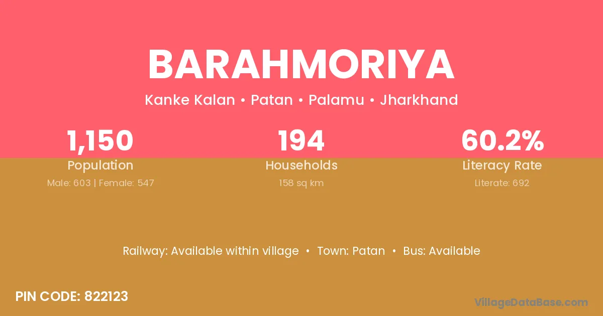 Barahmoriya village has a total population of 1,150 people, of which 603 are males and 547 are females.