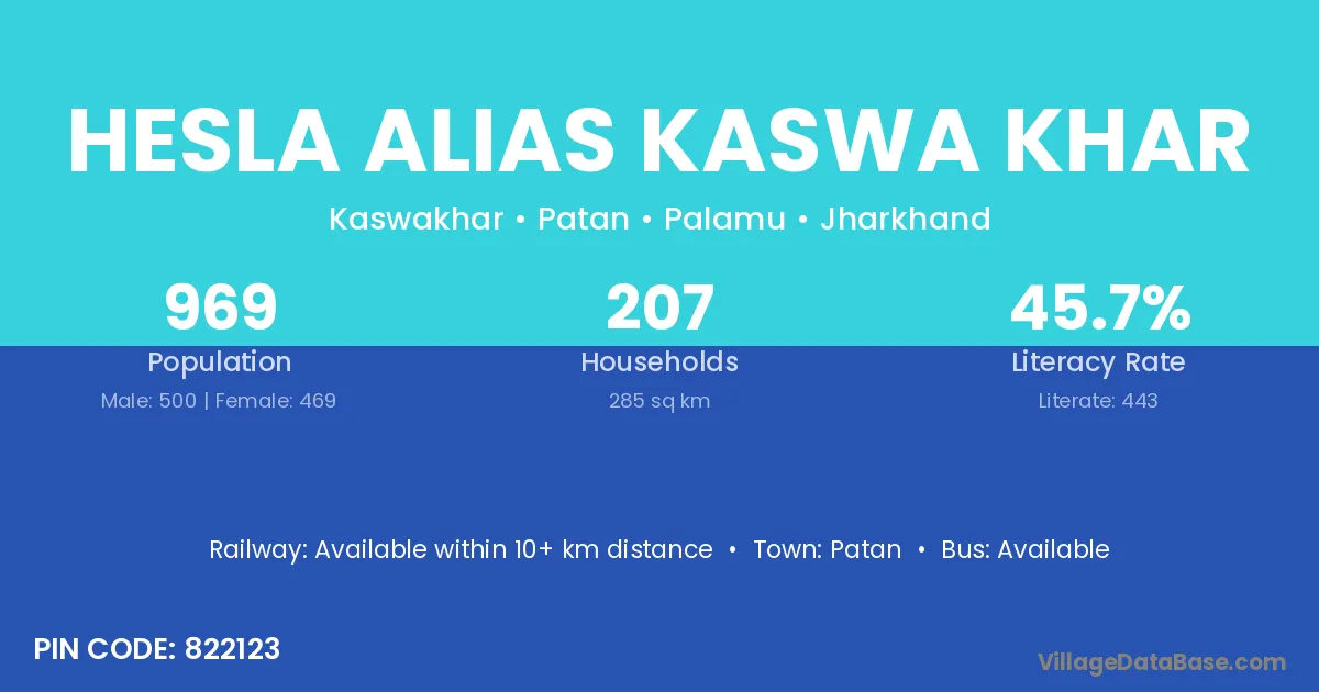 Hesla Alias Kaswa Khar village has a total population of 969 people, of which 500 are males and 469 are females.