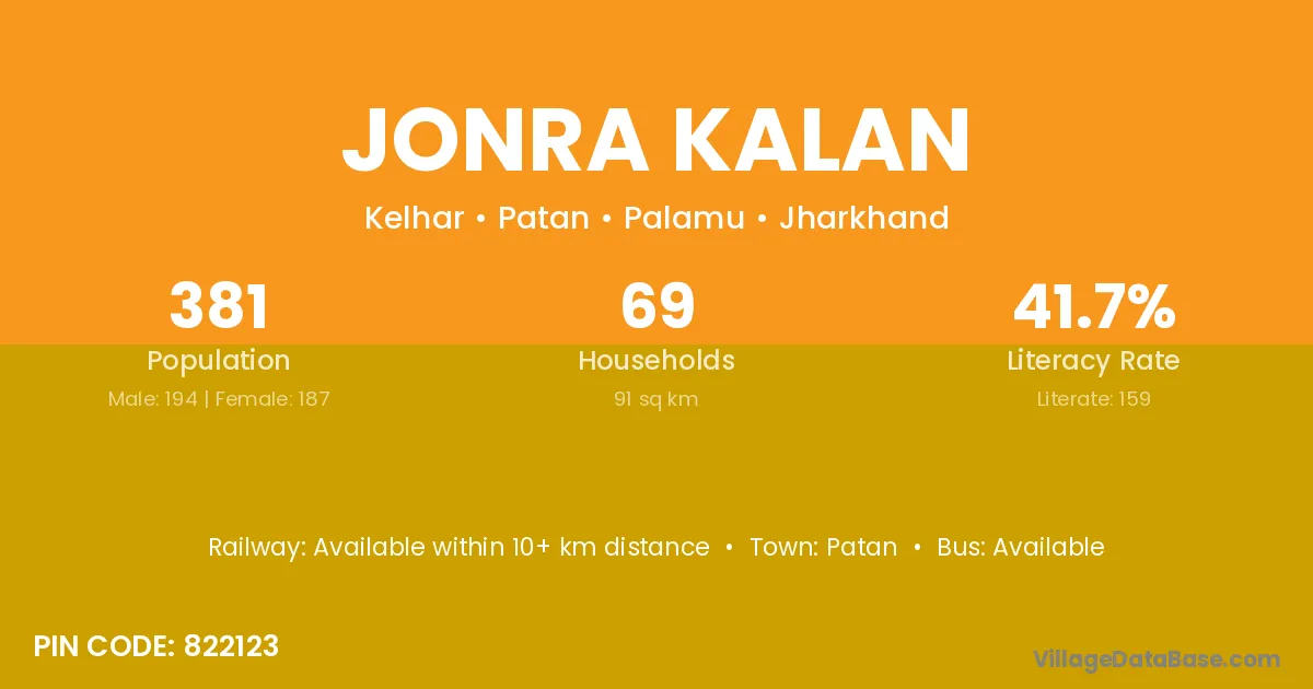 Jonra Kalan village has a total population of 381 people, of which 194 are males and 187 are females.