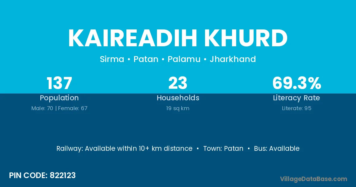 Kaireadih Khurd village has a total population of 137 people, of which 70 are males and 67 are females.