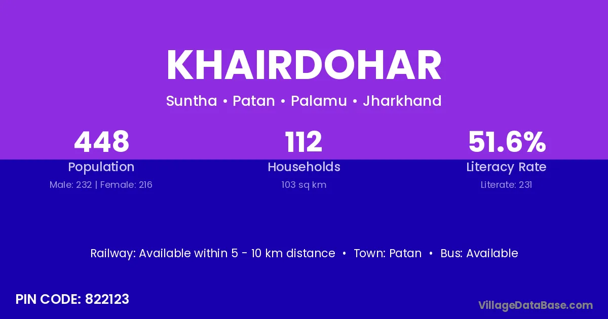 Khairdohar village has a total population of 448 people, of which 232 are males and 216 are females.