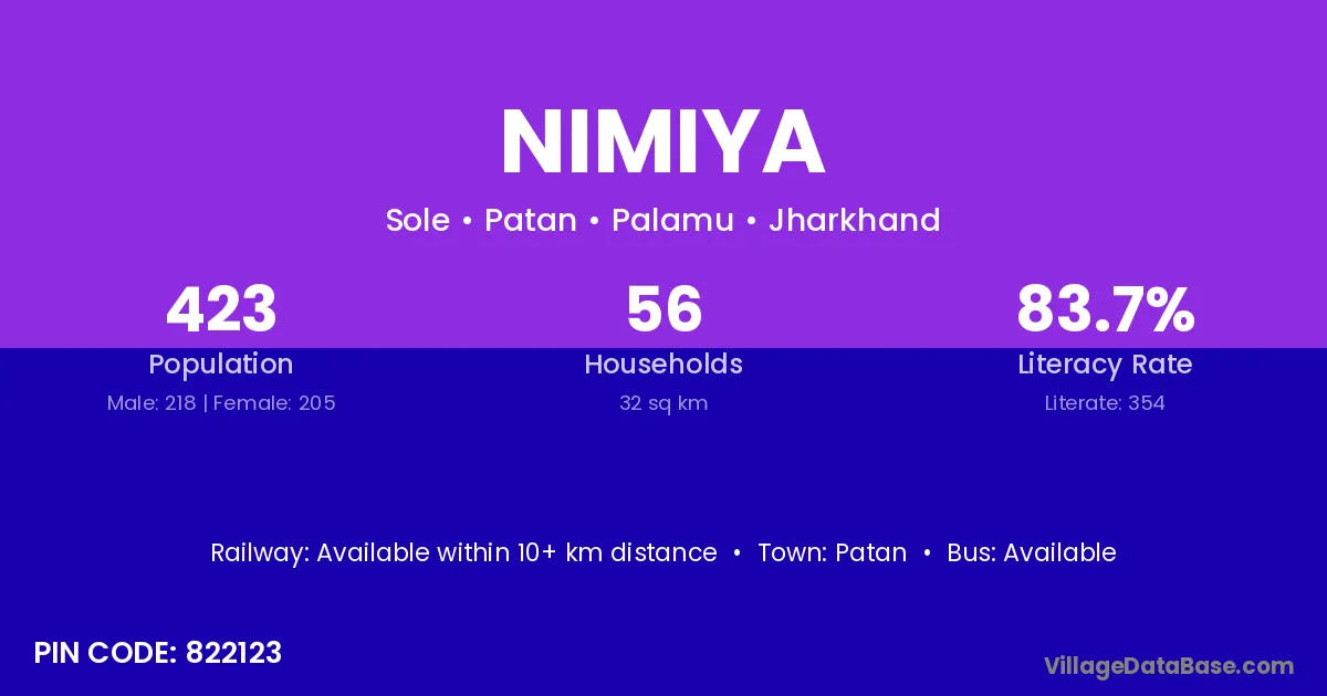 Nimiya village is located in the Patan Subdivision of the Palamu district in Jharkhand .