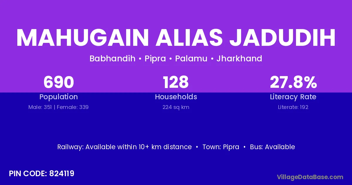 Mahugain Alias Jadudih village has a total population of 690 people, of which 351 are males and 339 are females.
