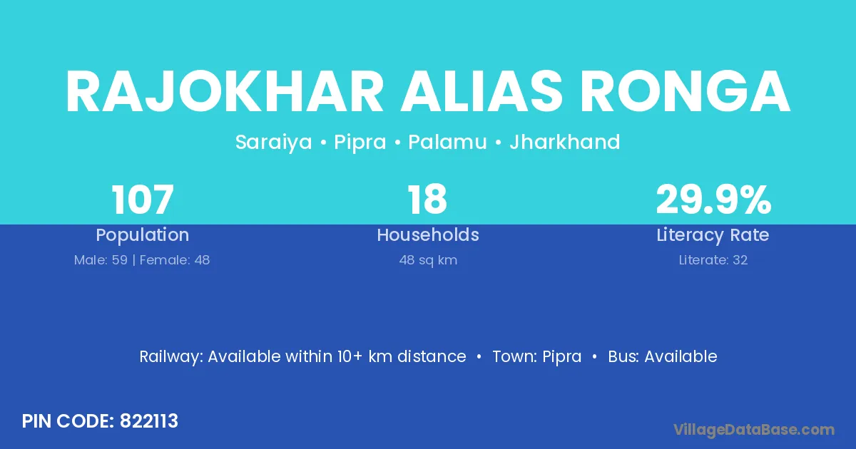 Rajokhar Alias Ronga village has a total population of 107 people, of which 59 are males and 48 are females.