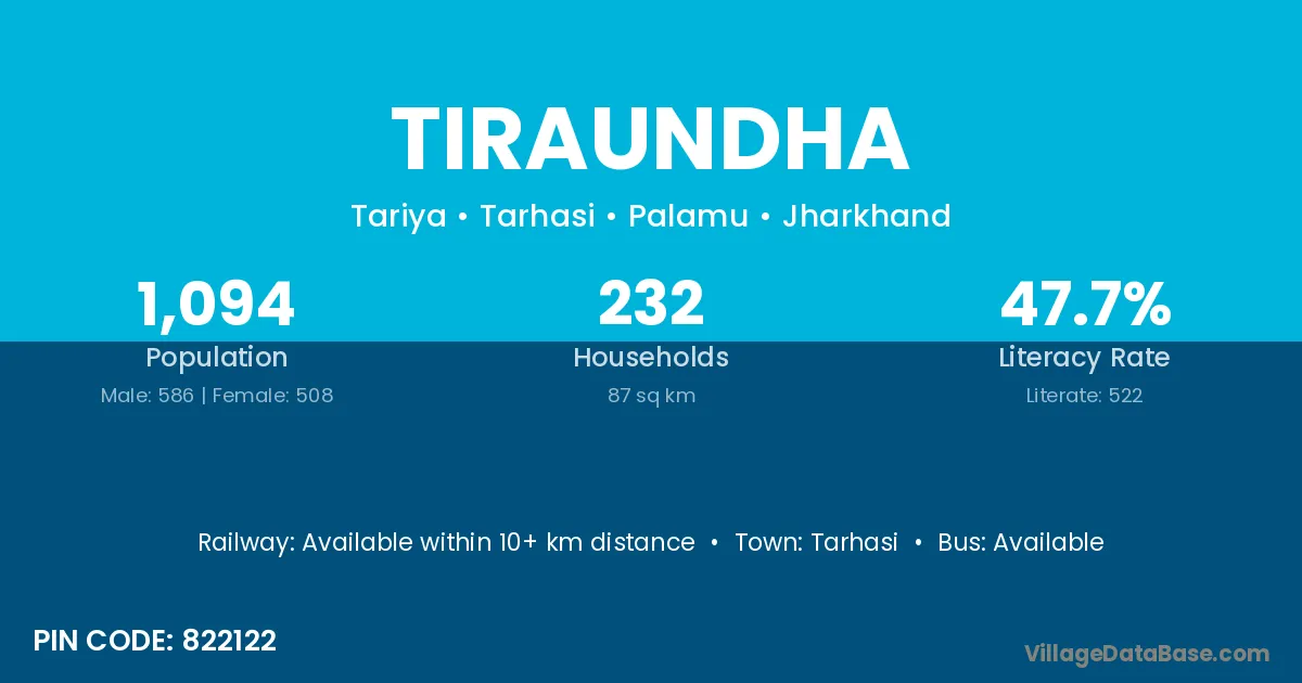Tiraundha village has a total population of 1,094 people, of which 586 are males and 508 are females.